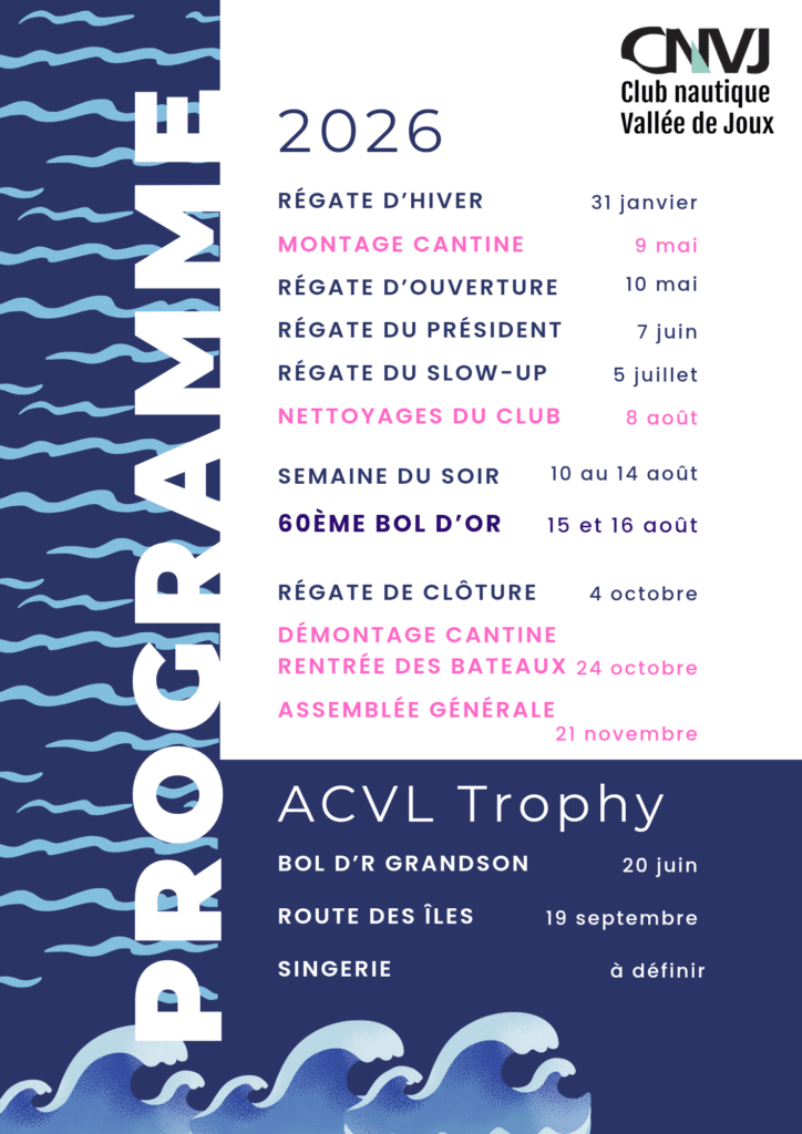 Ne manquez pas les informations et nouvelles du club nautique Vallée de Joux. Vous recevrez également les rappels pour les événements que nous organisons.
